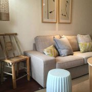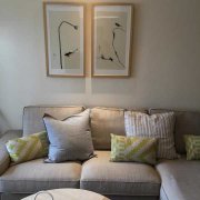 5. 中式禅意的装饰画,纯棉布沙发,淡黄色墙面,空间素净。