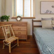10. 卧室一角的床边有梳妆台和小竹椅。