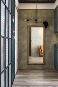 玄關旁即是大面積黑板牆,充分提供記事留言與塗鴉功能,滿溢童趣。連接壓力閥的金屬管線裝設於木作全身鏡上方,用充滿工業感的方式提醒進出者留意服儀整潔,手漆質感的暗藍置物櫃安穩的鑲嵌在紅磚電視牆後方,為玄關帶來俐落的收納機能。大面積鋪敘海島型木地板,為開放式空間注入溫馨氛圍,另一方面,也為特殊漆展現的冷調水泥粉光質感提升溫度。