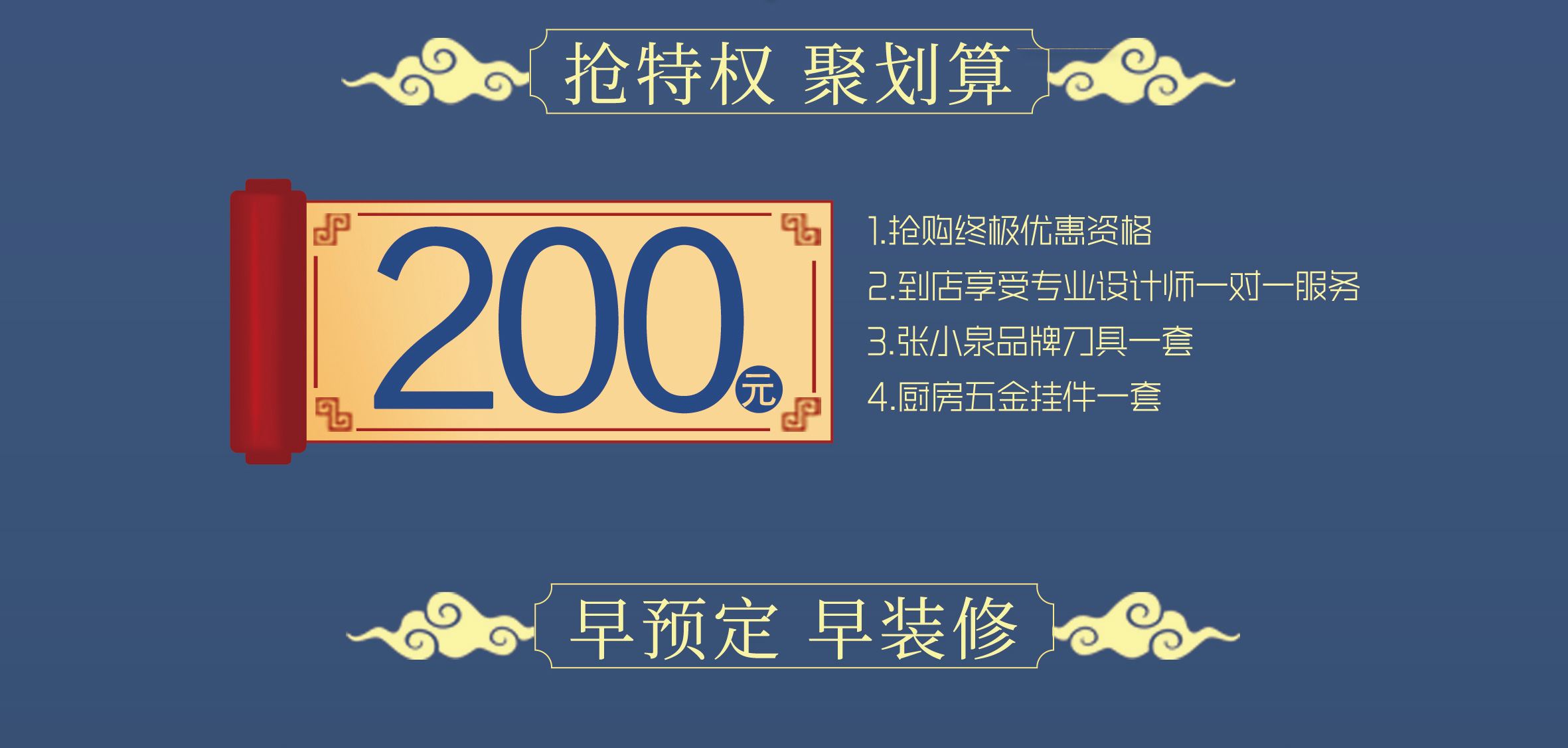 客户缴纳200元订金,即可拥有终极优惠资格、享受专业设计师一对一服务、赠送张小泉刀具一套及厨房五金挂件一套。后期到店体验不满意,200元全部退还,现只开放199个名额,仅限4月26日22:00前确认转账200元的客户享受。