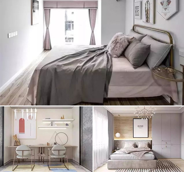 这一款墙壁、沙发、布艺靠枕、床的颜色是淡灰青色,温婉、朦胧气质营造出来,具有少女气质。