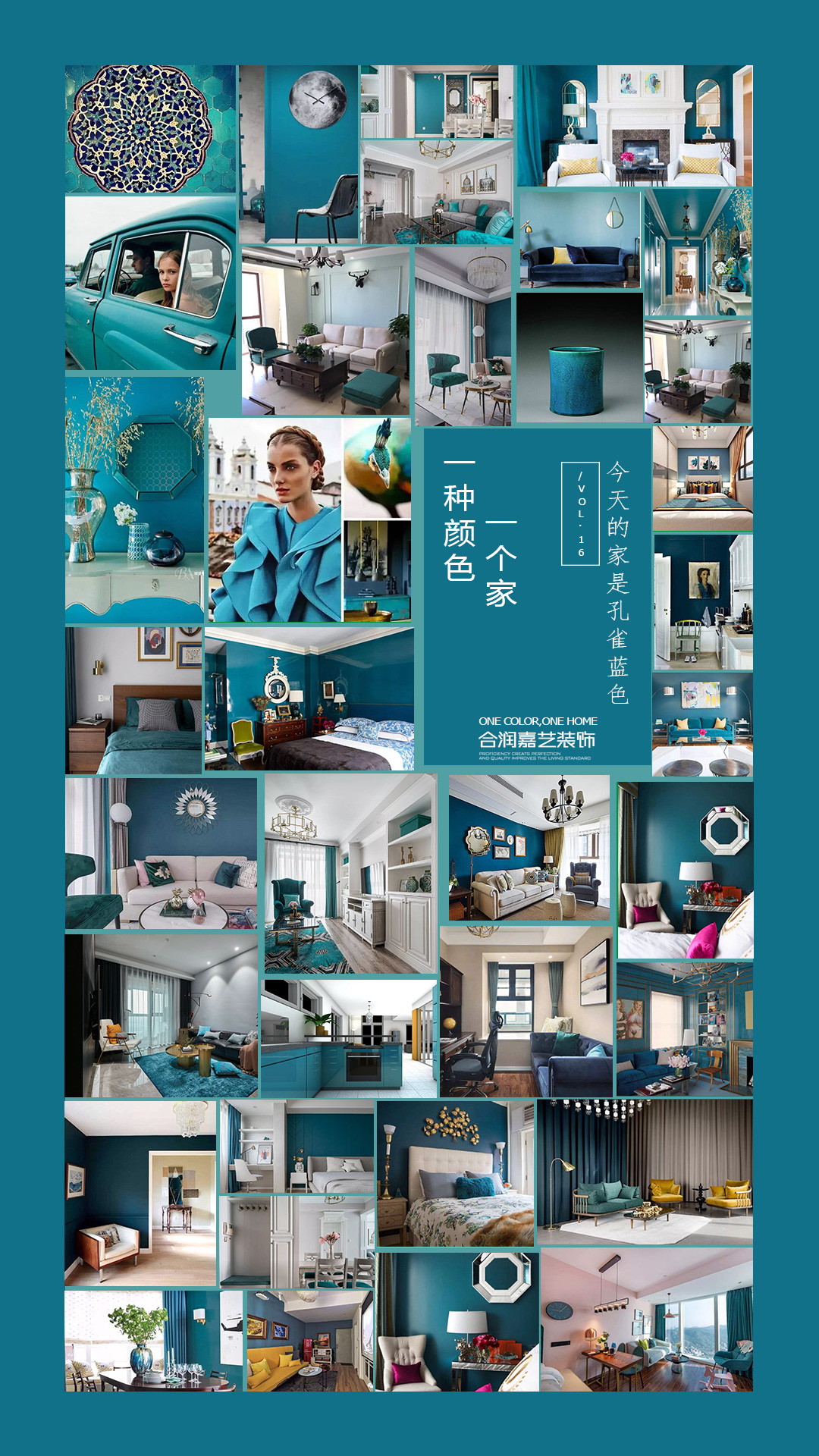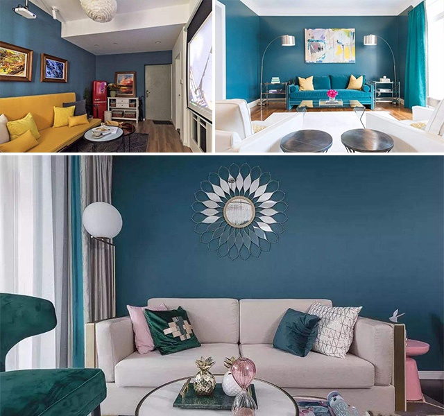 孔雀蓝色的墙面也是相当新颖的运用,辅以深浅的变化,做出层次感,再运用其他颜色做对比,让空间饱满,生动。