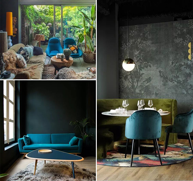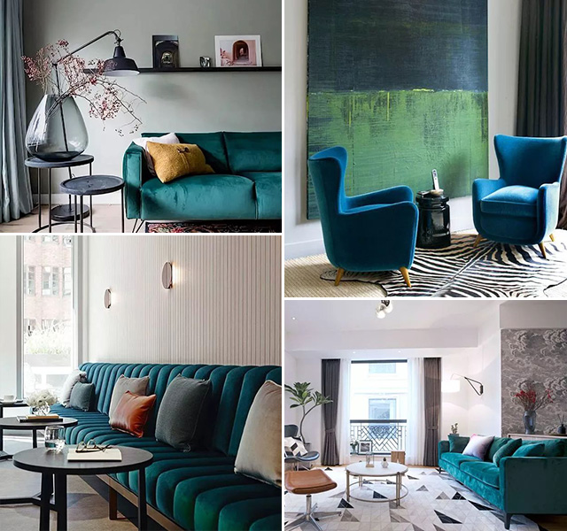 将孔雀蓝沙发或椅子放置在暗色调的空间里,它所散发的自然光感,饱满的色调撞击出强劲的吸引力,中和了空间的沉闷感。