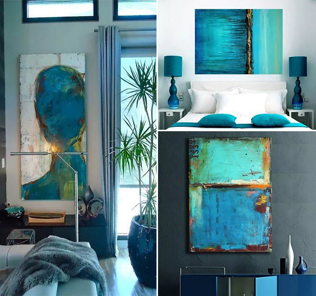 孔雀蓝的抽象装饰画,更能将这一抹变化莫测的神秘感,演绎的淋漓尽致。