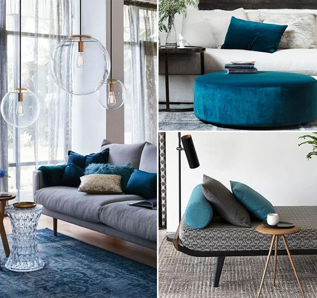 不想大面积使用孔雀蓝的话,那么可以给自己的沙发上放一个小小的抱枕,也能让人眼前一亮。