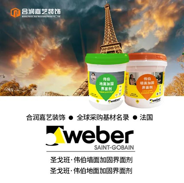 合润嘉艺装饰选用的圣戈班.韦伯未加增稠剂的墙固、地固的渗透性是普通界面剂或墙地固的5倍,更能深入基底,封闭、固化的效果更好,使装饰面层与基底能够更好的结合,大大降低墙面容易出现粉化、起壳、开裂的几率。
