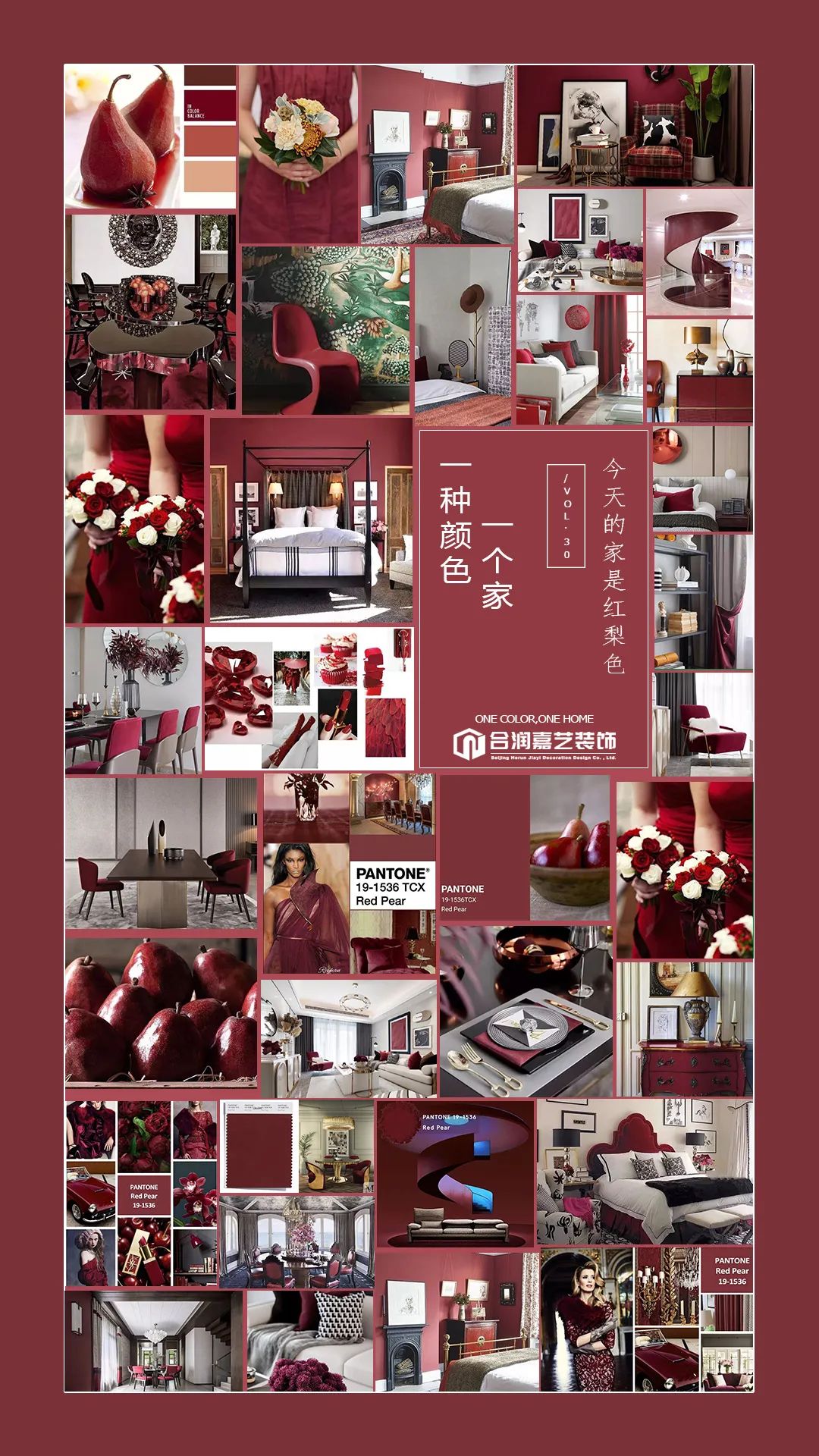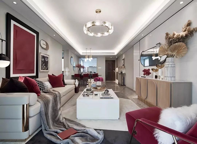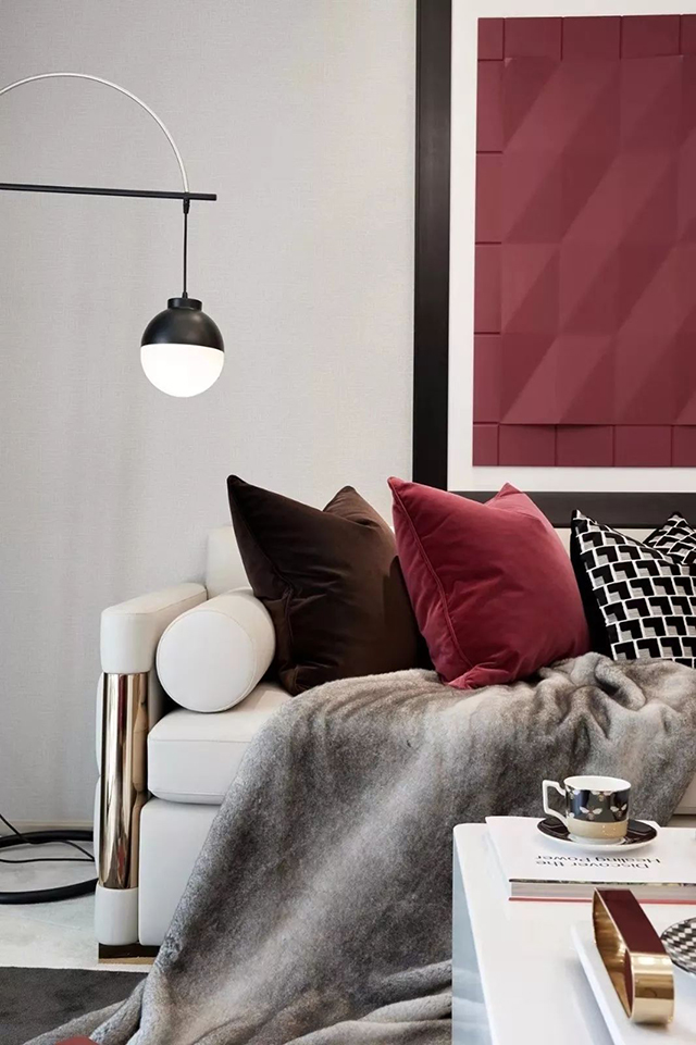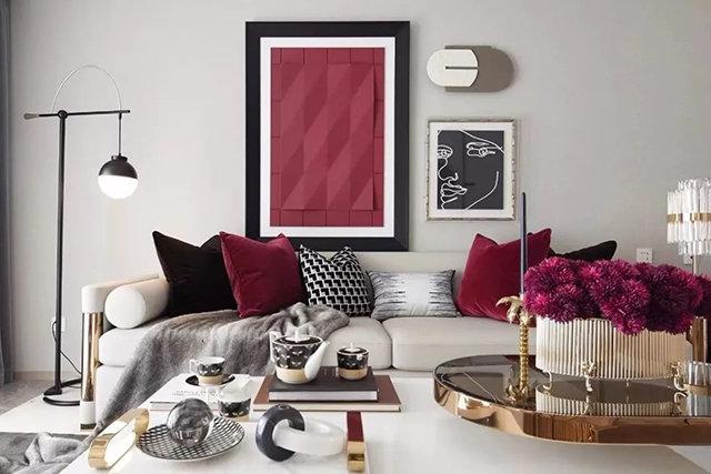 红梨色使用也多种多样,空间整体配色,沙发、椅子、抱枕、地毯、花卉、装饰画等都可以采用红梨色或跟它相近的颜色,由此增添空间活力,营造出摩登复古感,但是要根据一定的搭配技巧,否则效果适得其反。