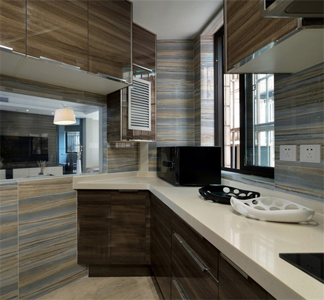 21、台面材质建议选用防火、防水、易清洗的材质做台面,目前石英石使用居多;