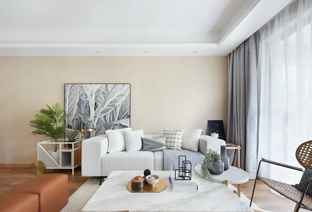 驼色,来源于大自然的颜色,让人联想到苍茫的沙漠、粗糙的巖石……然而就是这种质朴的颜色却具有一种非常都市化的味道。不少设计师倾爱这种低调而又优雅的色彩,不同色彩的搭配与深浅的变化能慢慢地渗透出温暖优雅的时尚气息。深驼色的卧室墻,印花图案的窗帘搭配灰色床品,勾勒出都市时间个人空间。米色墻面色彩跟地毯完好呼应,咖啡色家具是室内的点睛之笔,让室内暖度倍增。